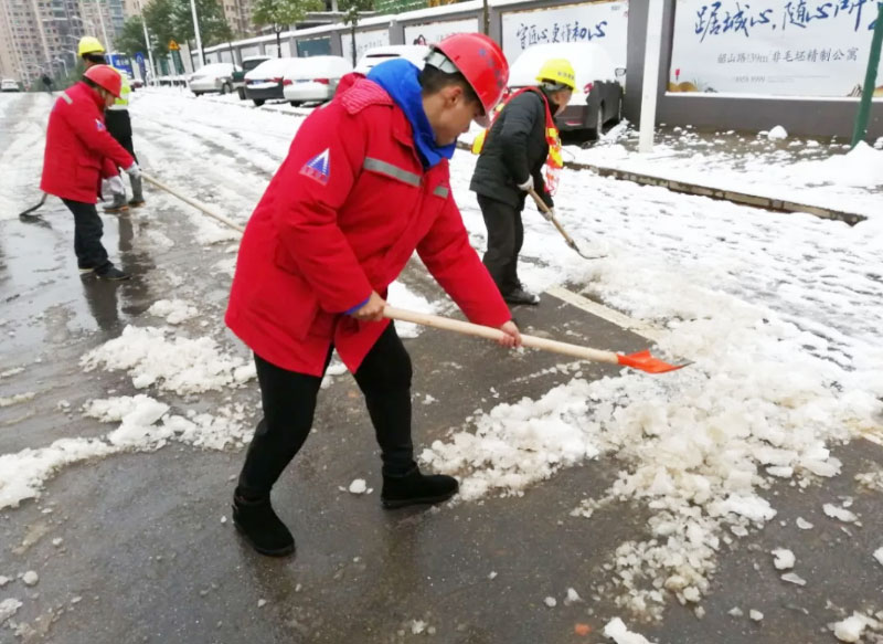 有想法就付諸于行動,簡短交流后,員工們開始有效的分工安排,開裝載機(jī)、拿鐵鍬、用掃帚、撒工業(yè)鹽、保障物資等,默契合作。